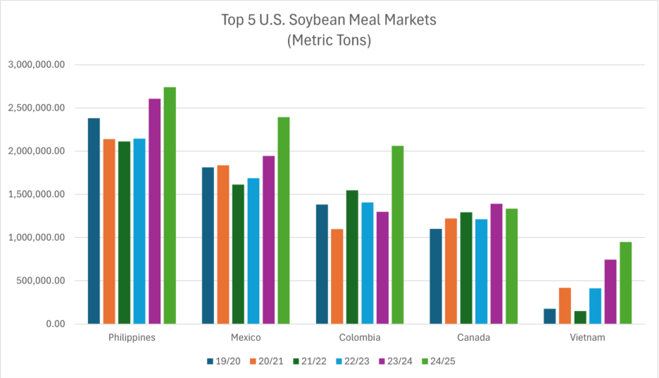 Since 2020, U.S. soybean meal exports have grown 32 percent, according to data from USDA. Last marketing year, the U.S. saw record soybean meal exports at 16.56 million metric tons – equivalent to 786 million bushels of soybeans or 17 percent of 2024 U.S. soybean production. Higher imports by the Philippines, Mexico, Colombia and Vietnam contributed to the record soybean meal exports.